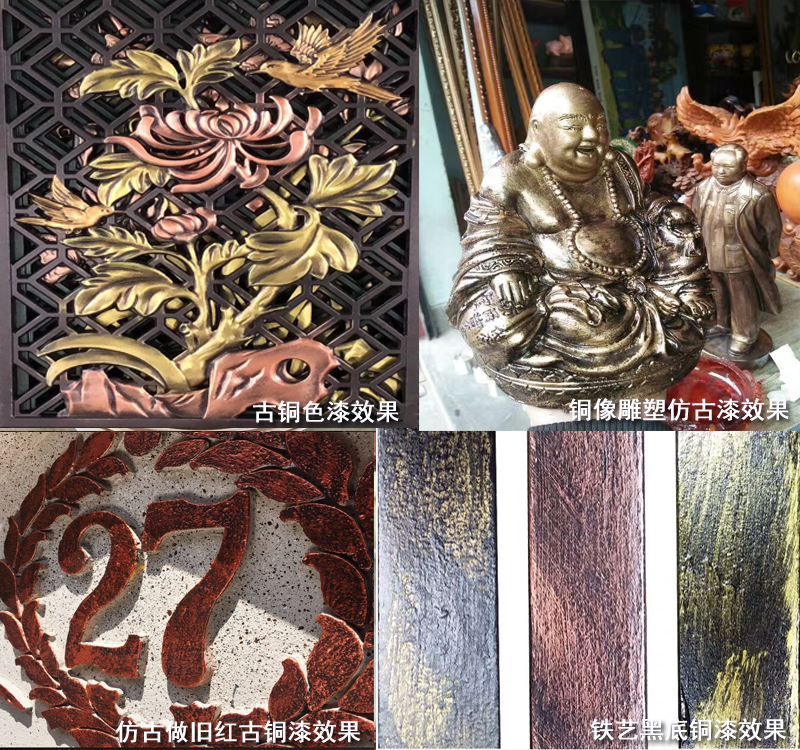 適用范圍:用于裝飾工程、廣告招牌、戶外雕塑、鐵藝護欄、五金制品、木制品、樹脂飾件、塑膠工藝品等產(chǎn)品的表面裝飾達到仿古的裝飾效果。